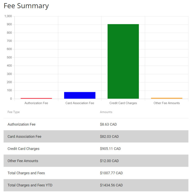 To the right is one month from one of our clinics and their total fees for that month of September 2024. Total fees for that month was $963(Total charges minus POS terminals, fraud prevention). Total revenue from Credit Cards that month was $59,915.